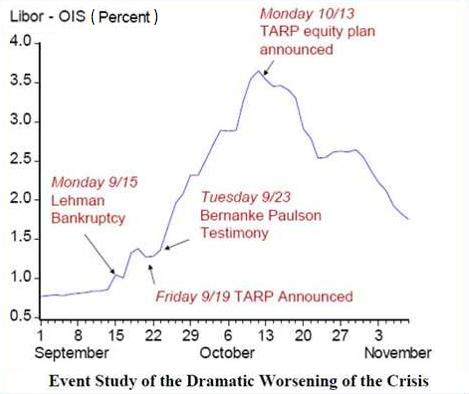 The graph (not from the article), interestingly, paints a thousand words as it depicts the Lehman bankruptcy and the resultant cost of debt rise followed by the forced TARP announcement, resulting in some relief. Expect to see such curves just around the corner!
