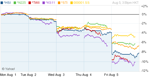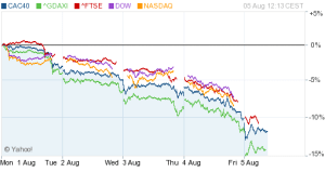 Wall Street suffered the biggest fall in two years, brought about by massive “sell-offs” by investors, triggered by “great fear” of a US recession, while European markets also fell significantly, driven by the sell-off contagion and worsening debt problems in Europe’s large economies, including Spain & Italy. Latin American and Asian markets were not far behind either, as the sell-off continued on a global spree.