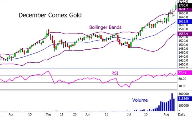 The graph shows the sharp price rise of gold in August. However, the most telling sign is the volumes traded in recent times, compared to over the previous months. Noteworthy is the high RSI (Relative Strength Index), which is generally indicative of an overbought situation, although here supported by price increases and prices touching the upper Bollinger. In other words, technically speaking (if you subscribe to such views), “sell” is still not signaled, since the indicators are not divergent.